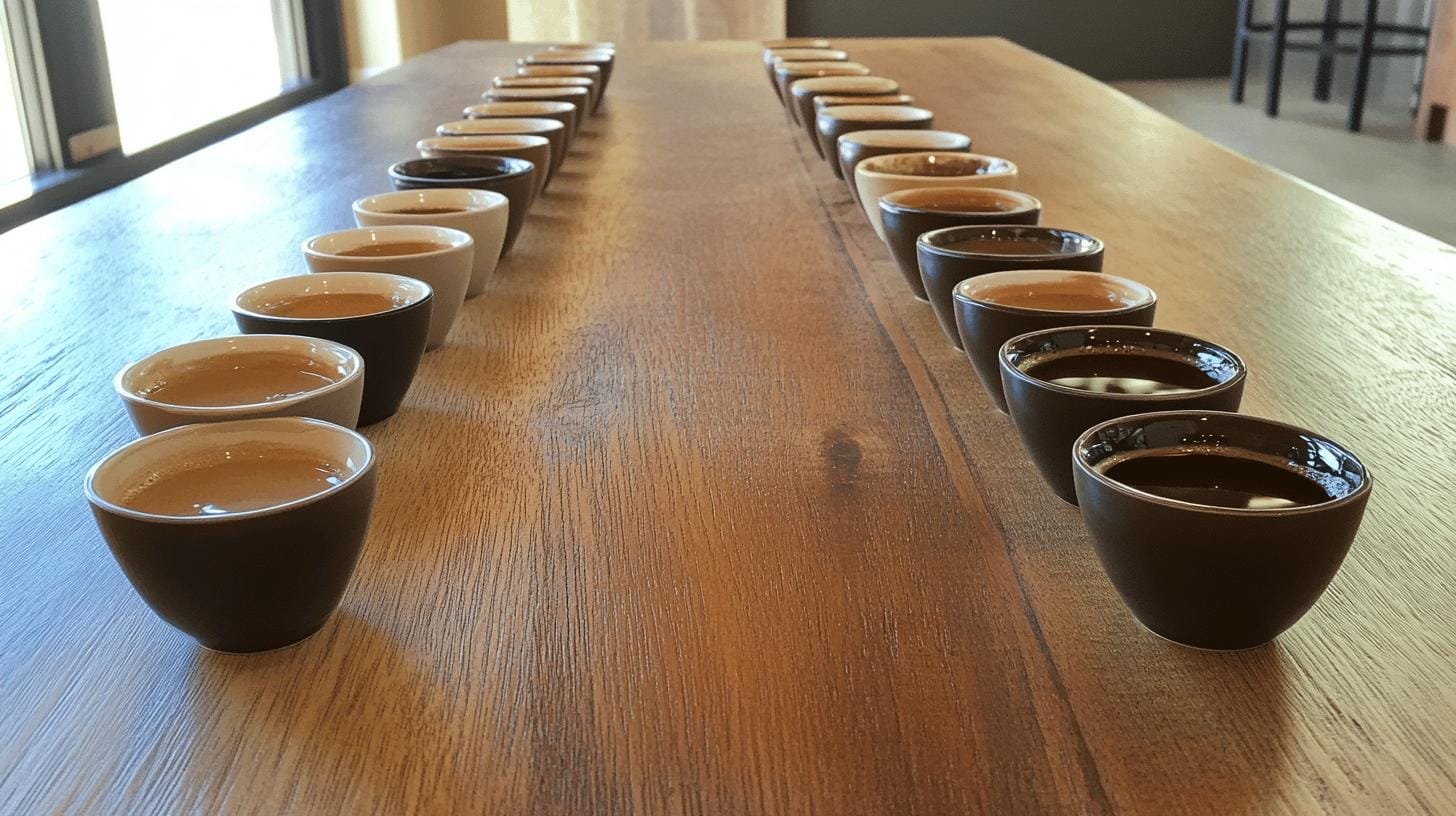 Coffee in tiny tasting cups arranged on a table - How to Do a Coffee Tasting.jpg