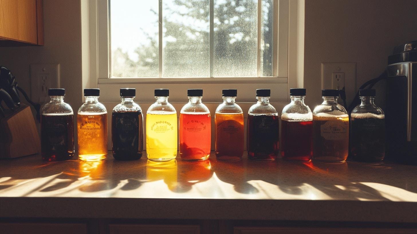 Commercial coffee syrups lined on a kitchen counter - Simple Syrup Flavors for Coffee: Top Picks